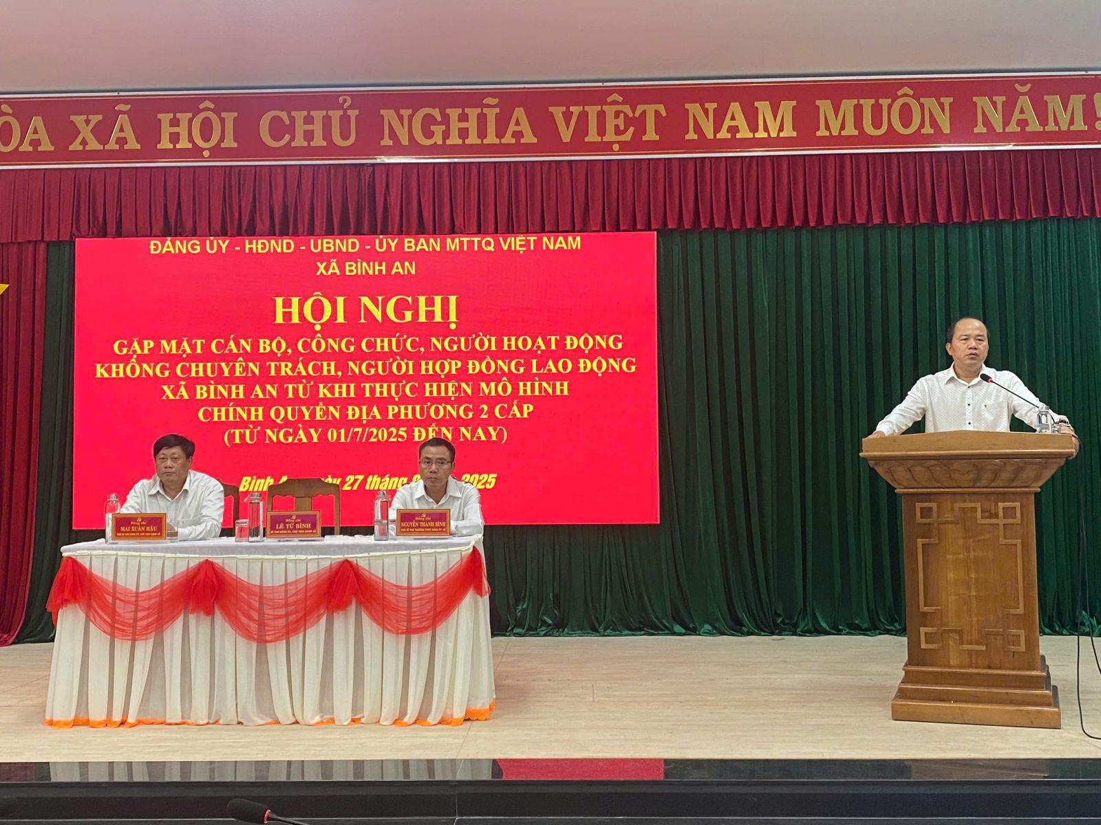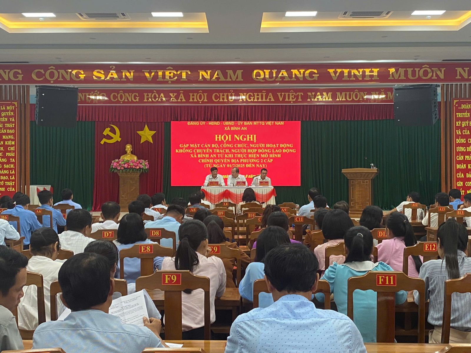 Tại hội nghị, đồng chí Mai Xuân Hậu – Phó Bí thư Đảng ủy, Chủ tịch UBND xã Bình An đã báo cáo sơ kết tình hình hoạt động của bộ máy chính quyền xã sau khi thực hiện mô hình chính quyền địa phương hai cấp theo quy định của Trung ương và chỉ đạo của Tỉnh ủy, UBND tỉnh. Mô hình mới đã góp phần nâng cao hiệu lực, hiệu quả quản lý nhà nước ở địa phương, tăng cường tính chủ động, linh hoạt trong điều hành, giảm bớt sự chồng chéo về chức năng, nhiệm vụ giữa các bộ phận, đồng thời tinh gọn bộ máy, tiết kiệm ngân sách và cải thiện chất lượng phục vụ nhân dân.